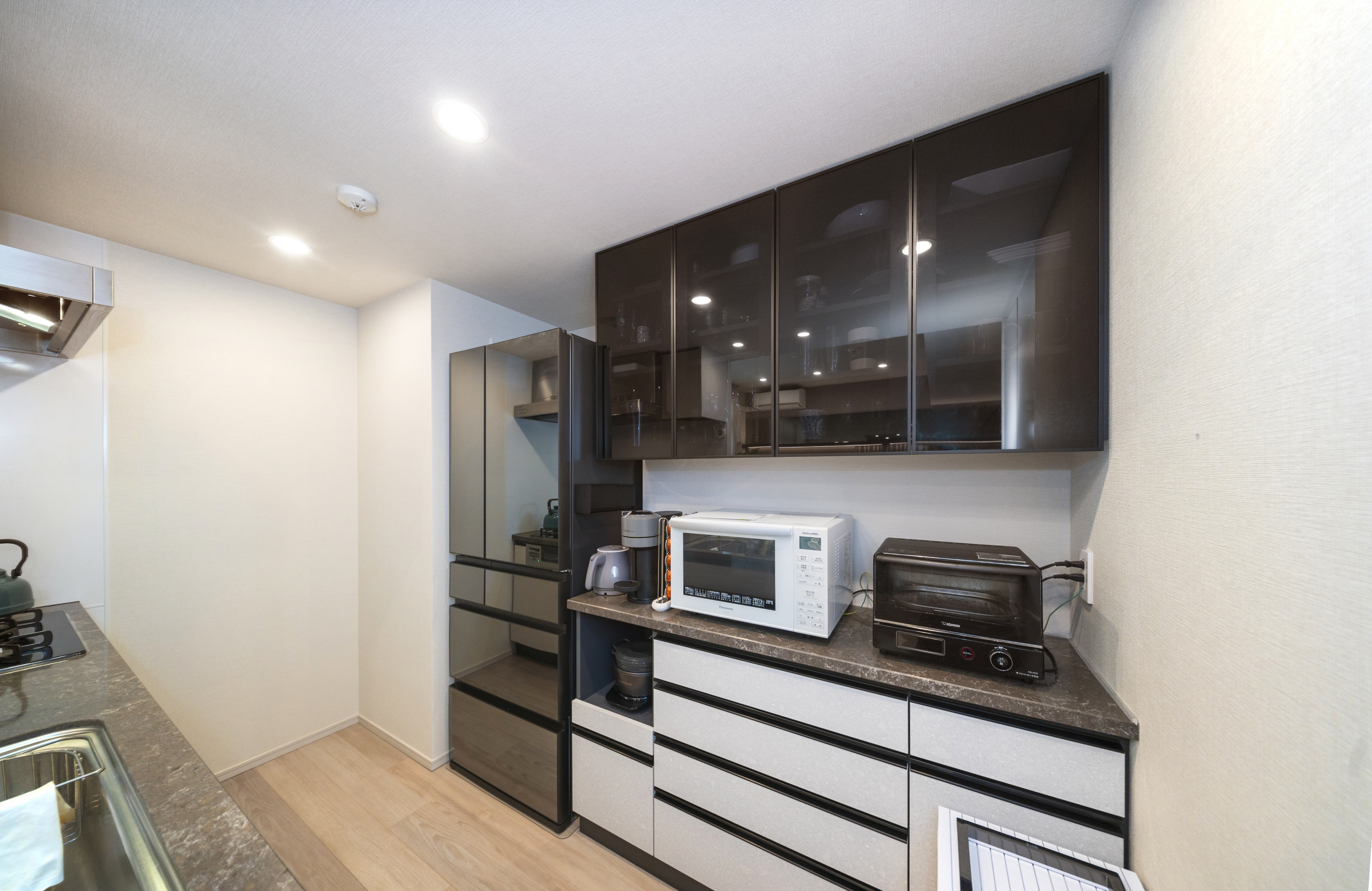 一方のキッチンには、黒いガラス扉のフローティングキャビネットを選び、シンプルでクールな雰囲気です。