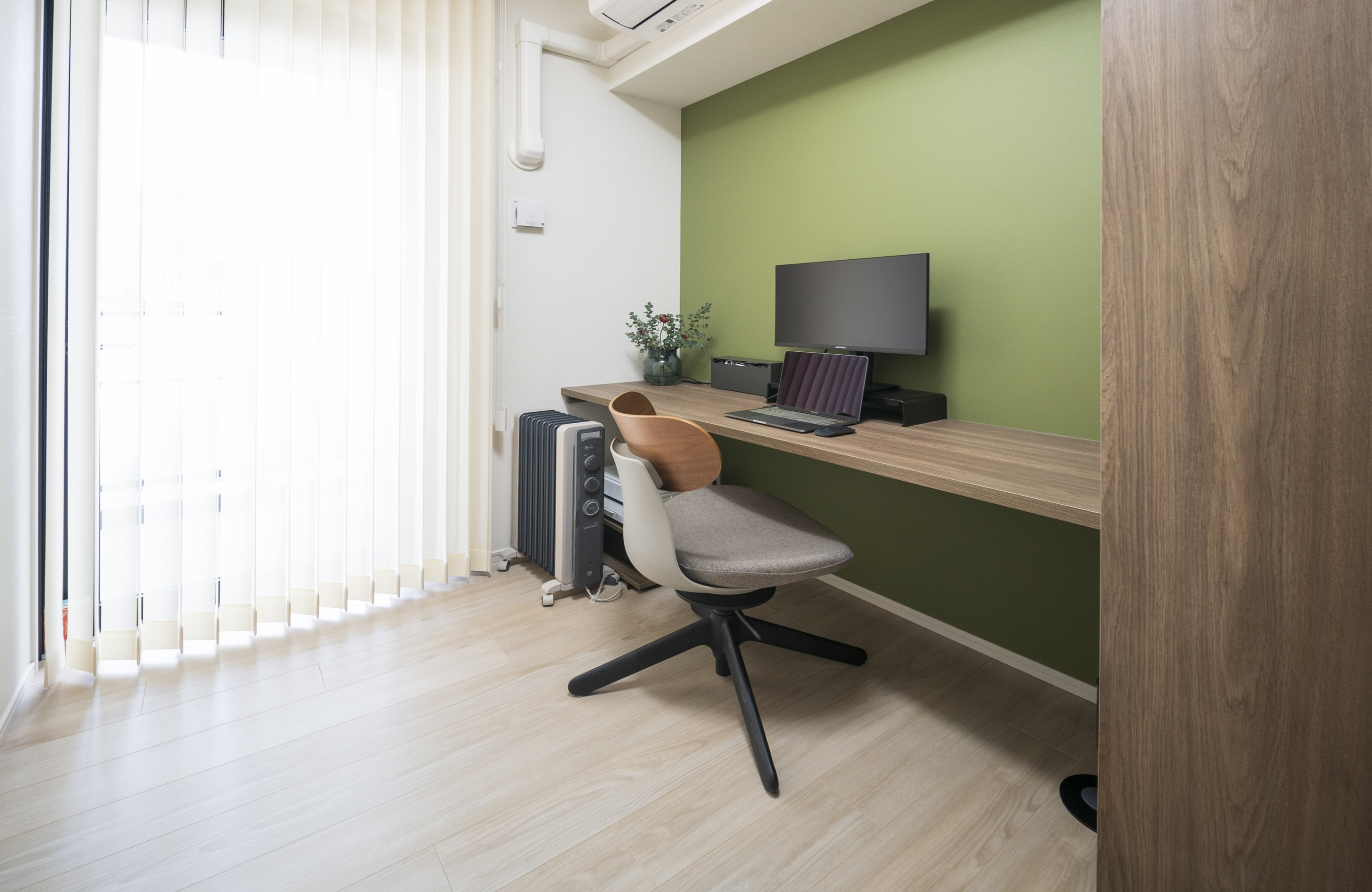 妻はフルリモート、夫は通勤とリモート半々くらいで仕事をしています。ふたりとも家で仕事をするときには、妻が個室、夫はリビングを使います。毎日仕事に集中できる環境を整えたかったので、個室の部屋については何度も打ち合わせを重ねました。落ち着いたグリーンの壁の色、使いやすいデスクの造作、たくさんの本が収納できるキャビネットがポイントです。本を見せない造りになっていますが、手前とデスク両側が本の収納棚になっています。