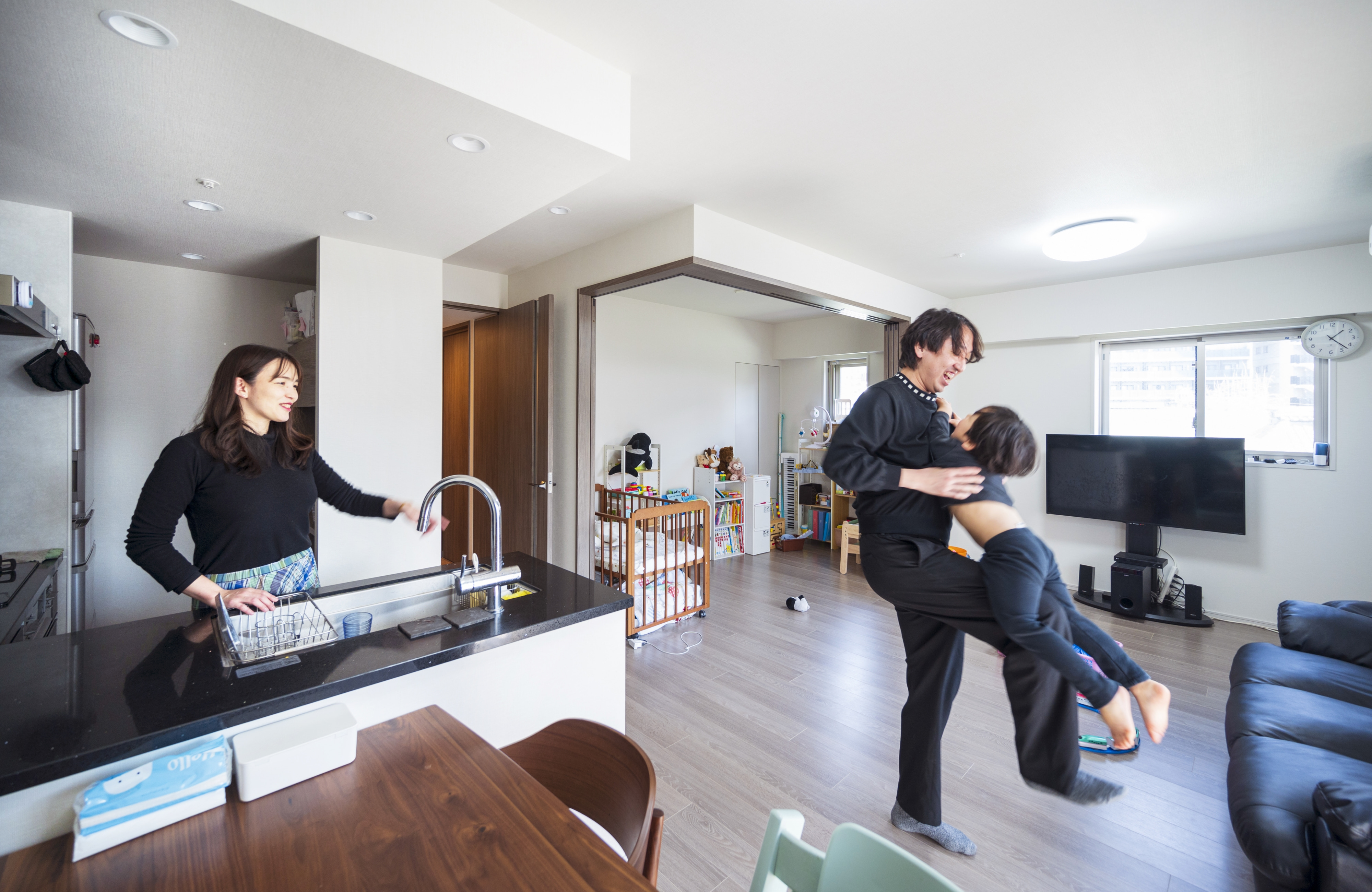 リビングに隣接する洋室は、現在はリビングルームと一体化させて使用しています。子どもたちが成長するにつれて、個室などに変更することが可能です。