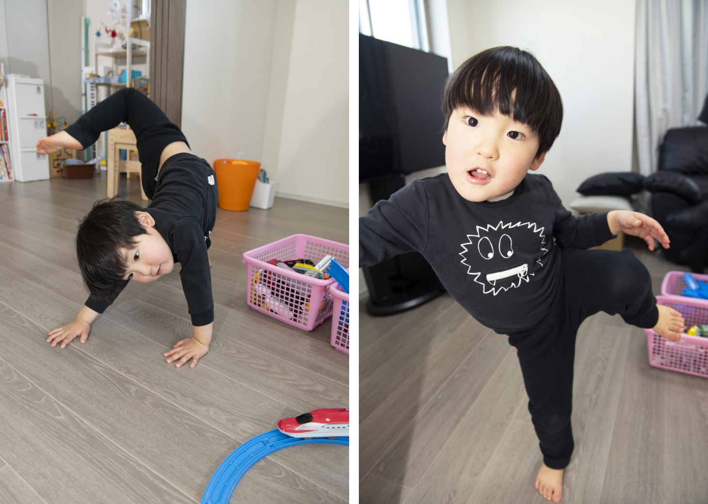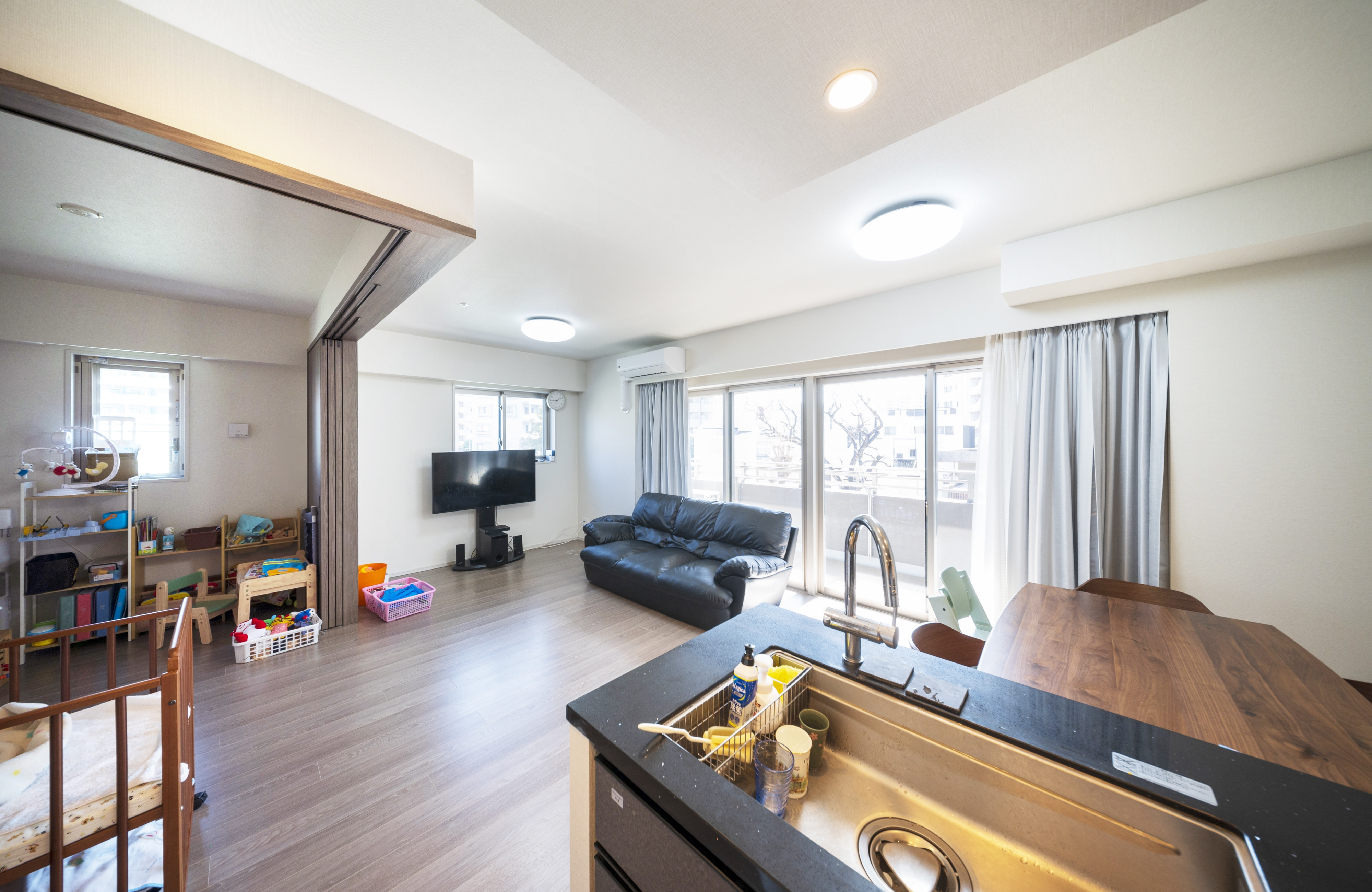 広々としたリビングがみんなの居場所です。キッチン、解放した続き部屋を合わせるとほぼ20畳、南向きで光がいっぱいに入ります。本来なら部屋に合うソファセットや壁装飾を入れたいところですが、今は、子どもが動き回れる空間の確保を優先しています。