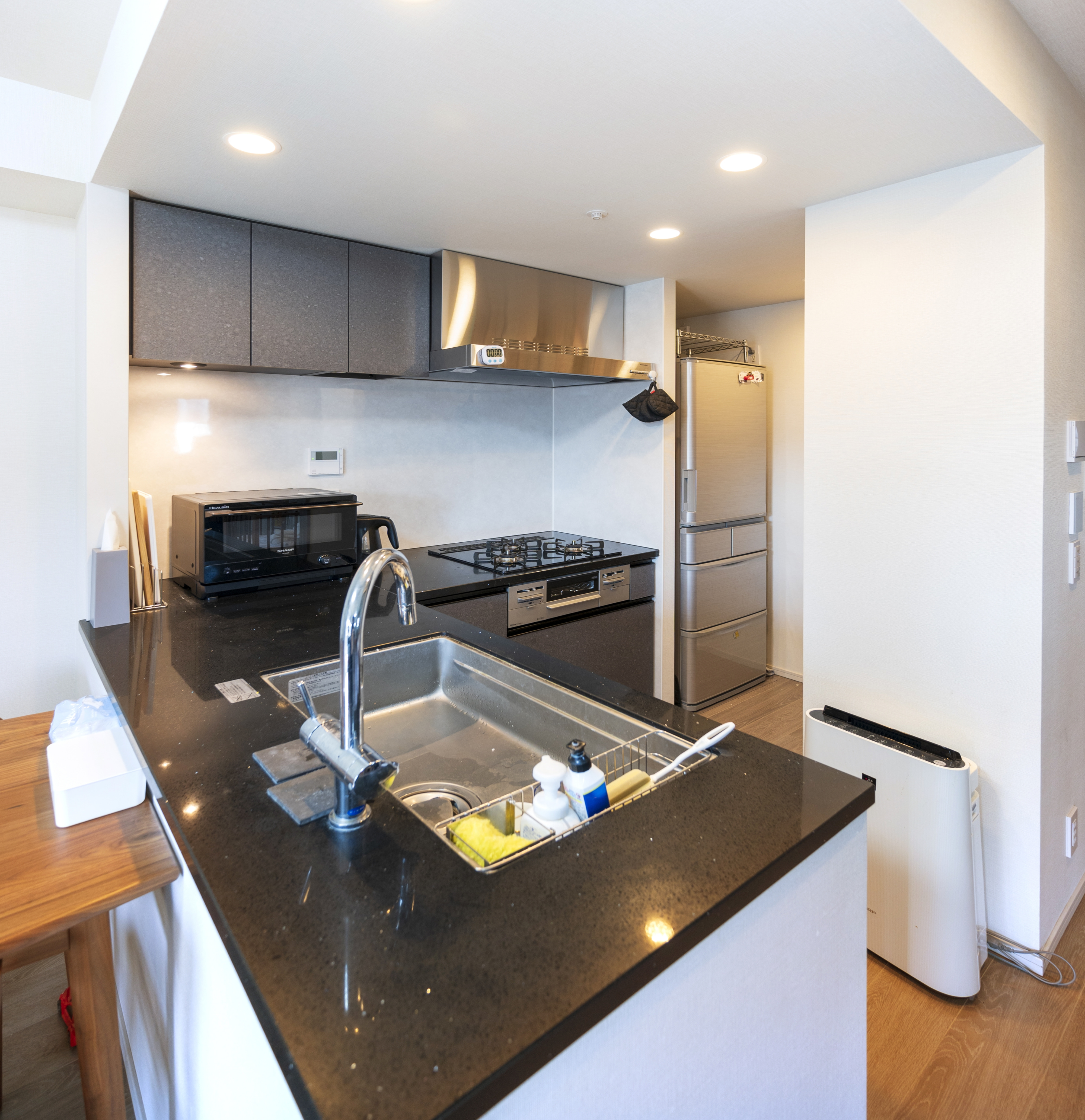 キッチンはL字型で、換気扇やキャビネットは壁際に収められています。キッチンカウンターは上部に何もなくスッキリ、リビングと一体化していて、空間の広がりを感じられます。