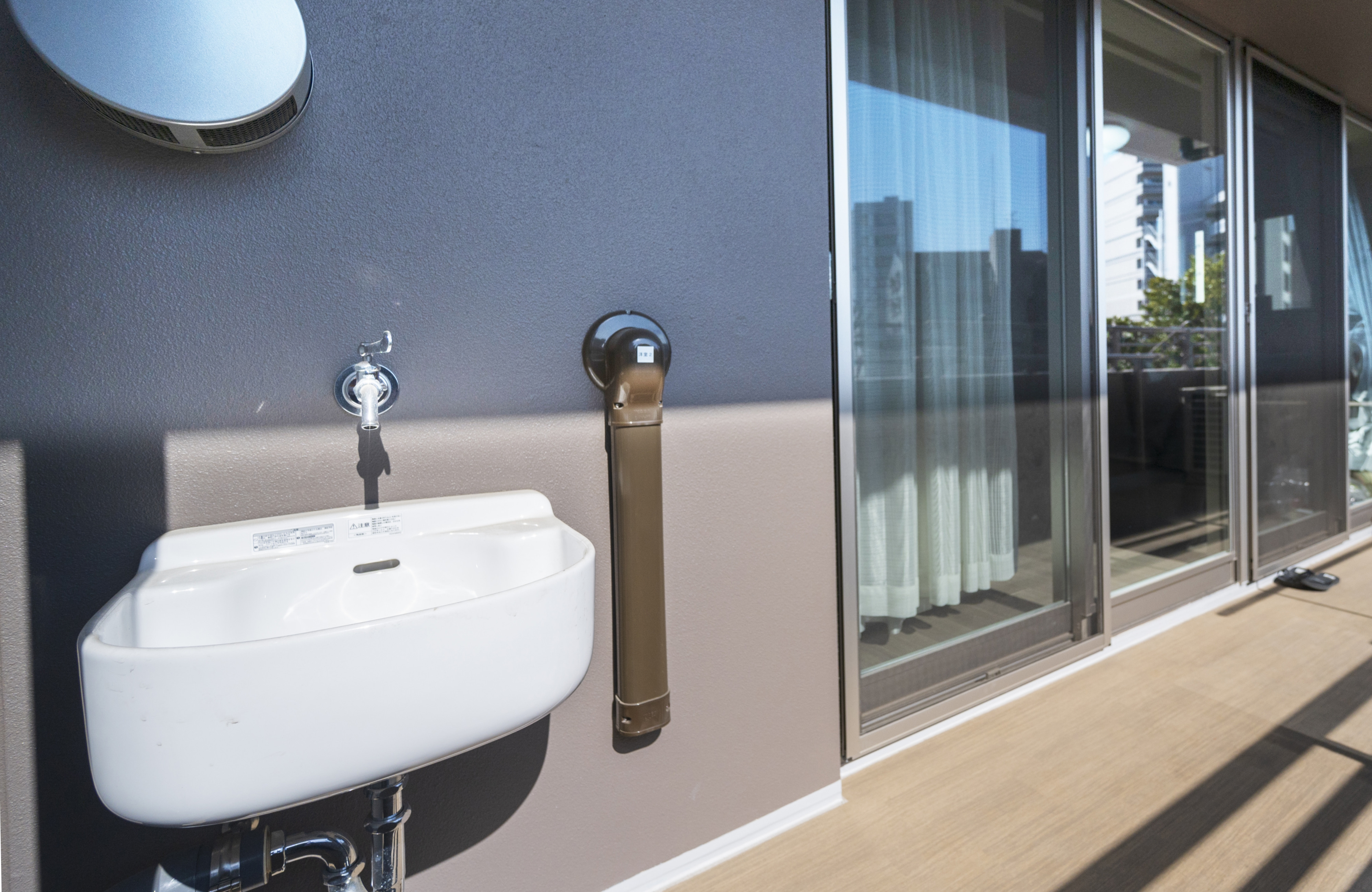 南向きのバルコニーは奥行きが広く、テーブルセットなどを置くこともできます。スロップシンクが設置されているので、夏になったらビニールプールを置いて水遊びをするのが楽しみです。