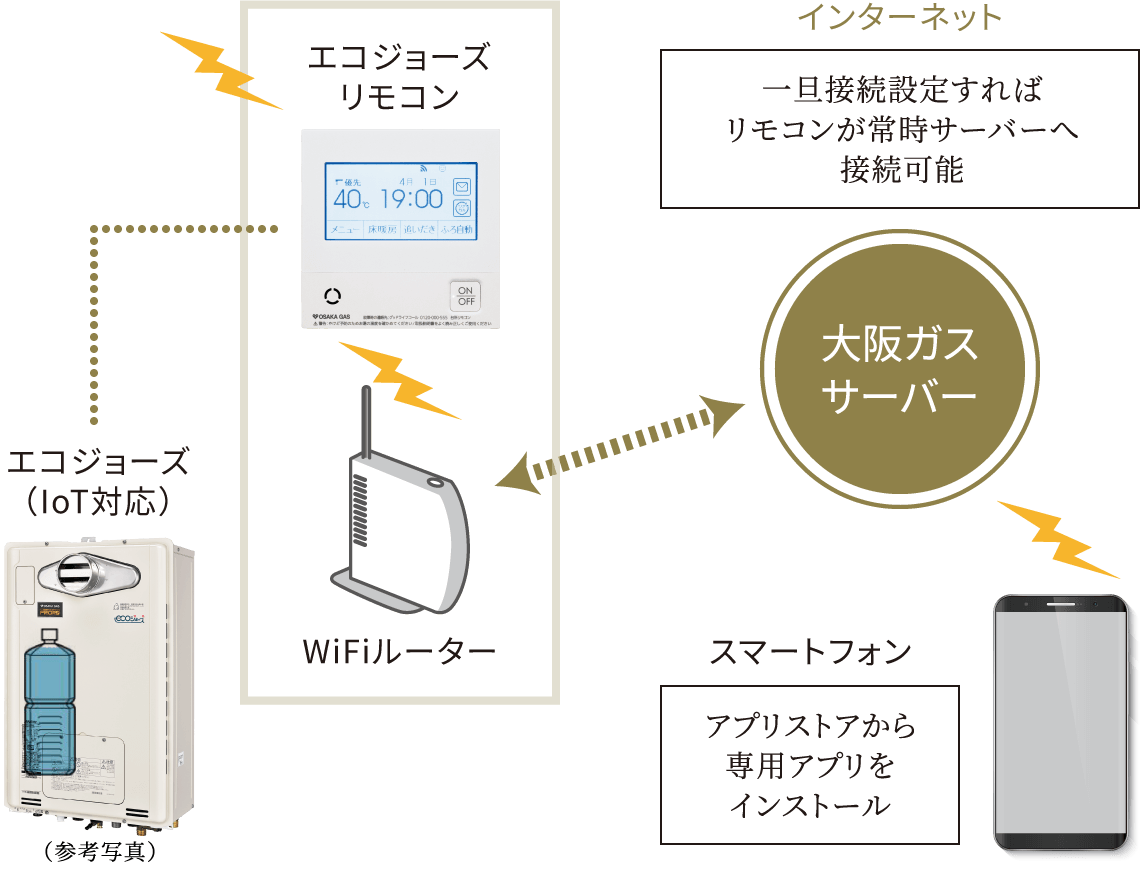 ※サービスのご利用にはインターネット環境と無線LAN環境が必要です。(モバイルルータやテザリング等ではご利用いただけません。)※インターネット環境・無線LAN環境・スマートフォンはお客さまでご準備ください。※無線LANルータは、WPA2/WPAの暗号化方式に対応したものが必要です。※ご使用のルータ、スマートフォン、通信環境によっては本サービスをご利用できない場合があります。※リモコンが大阪ガスサーバと通信するため、インターネットの通信費がかかります。※給湯器見守りにはリモコンMACの登録が必要となり、登録は大阪ガスサービスチェーンが行います。