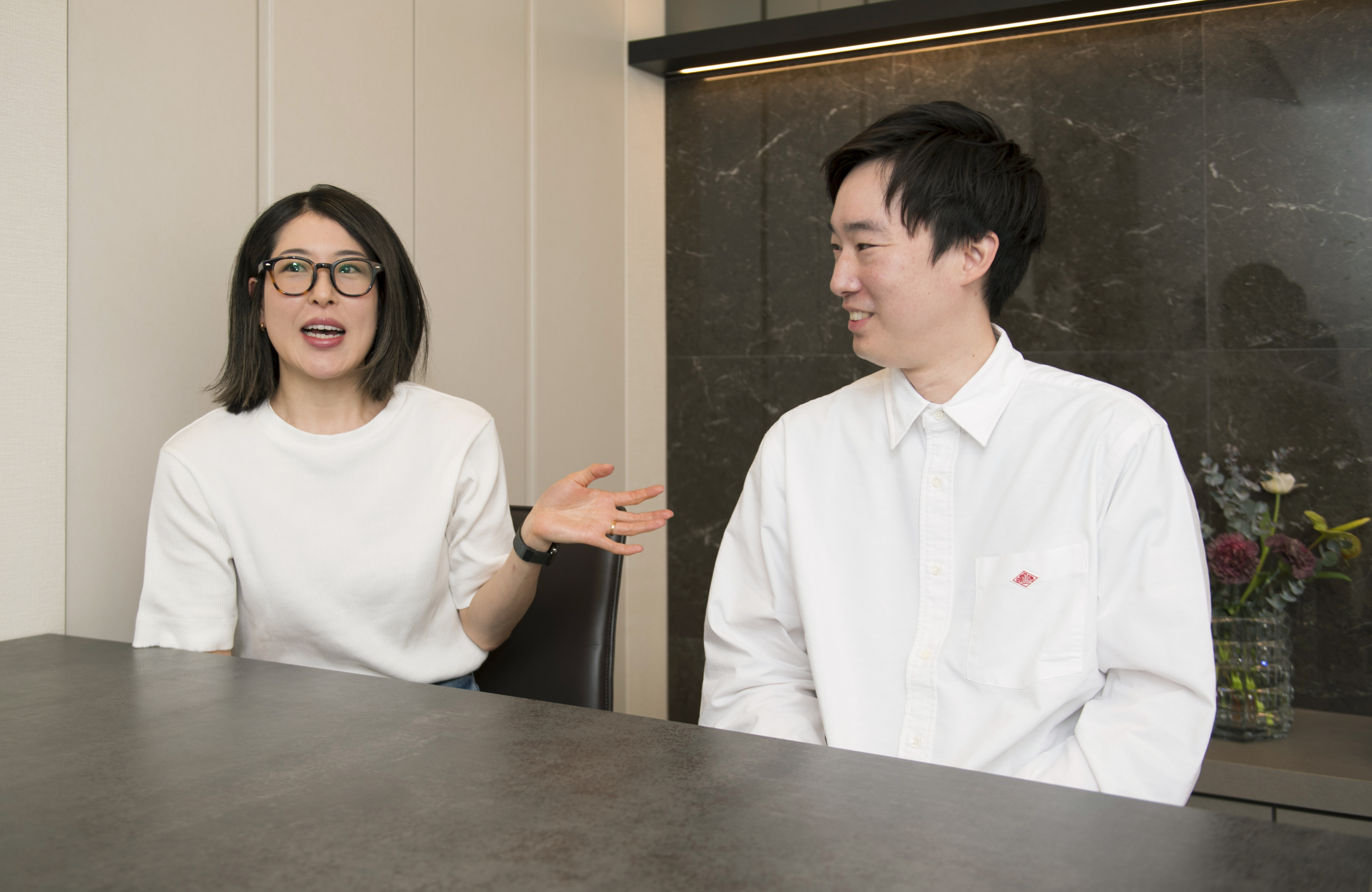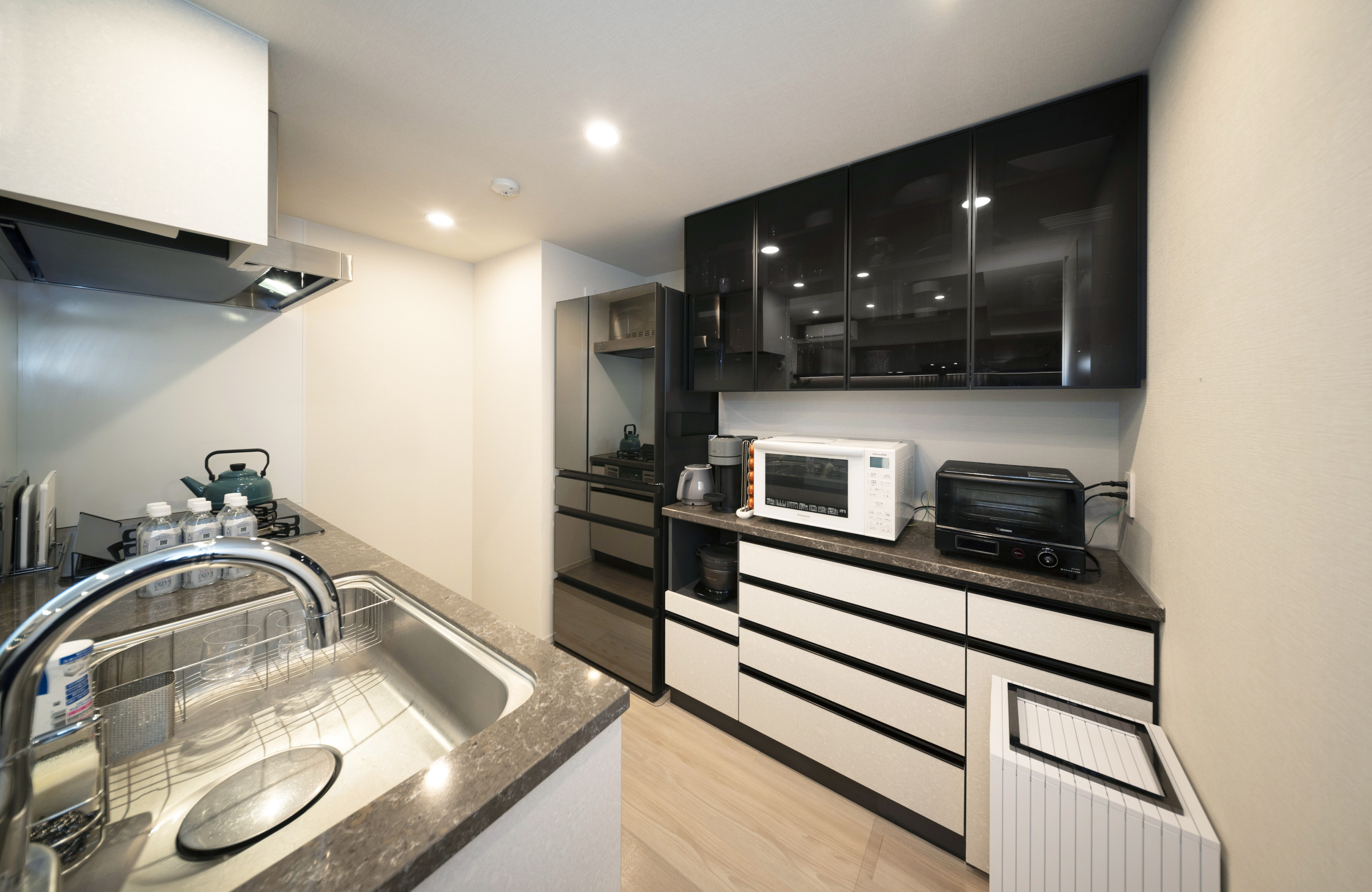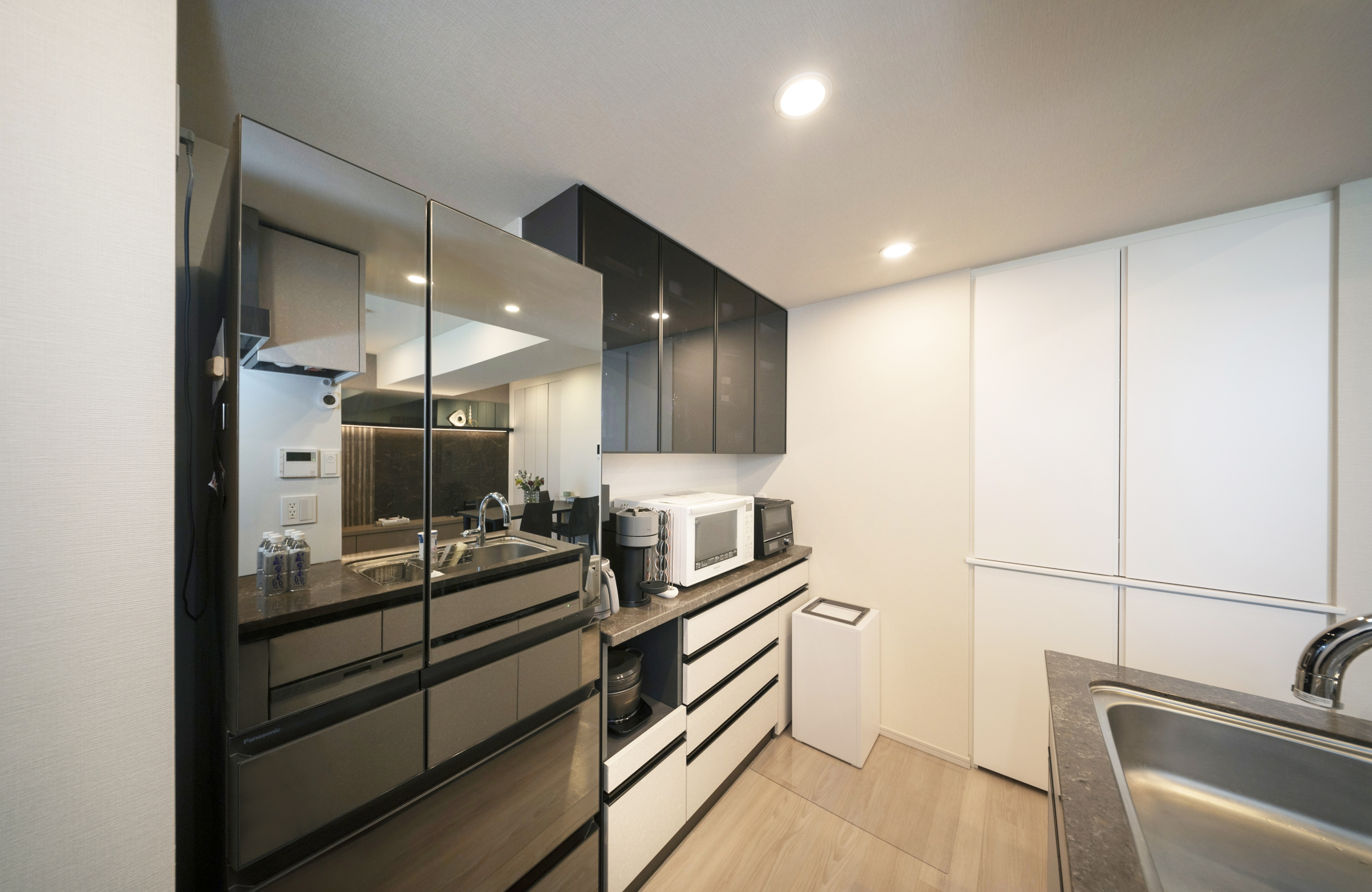 一方のキッチンには、黒いガラス扉のフローティングキャビネットを選び、シンプルでクールな雰囲気です。