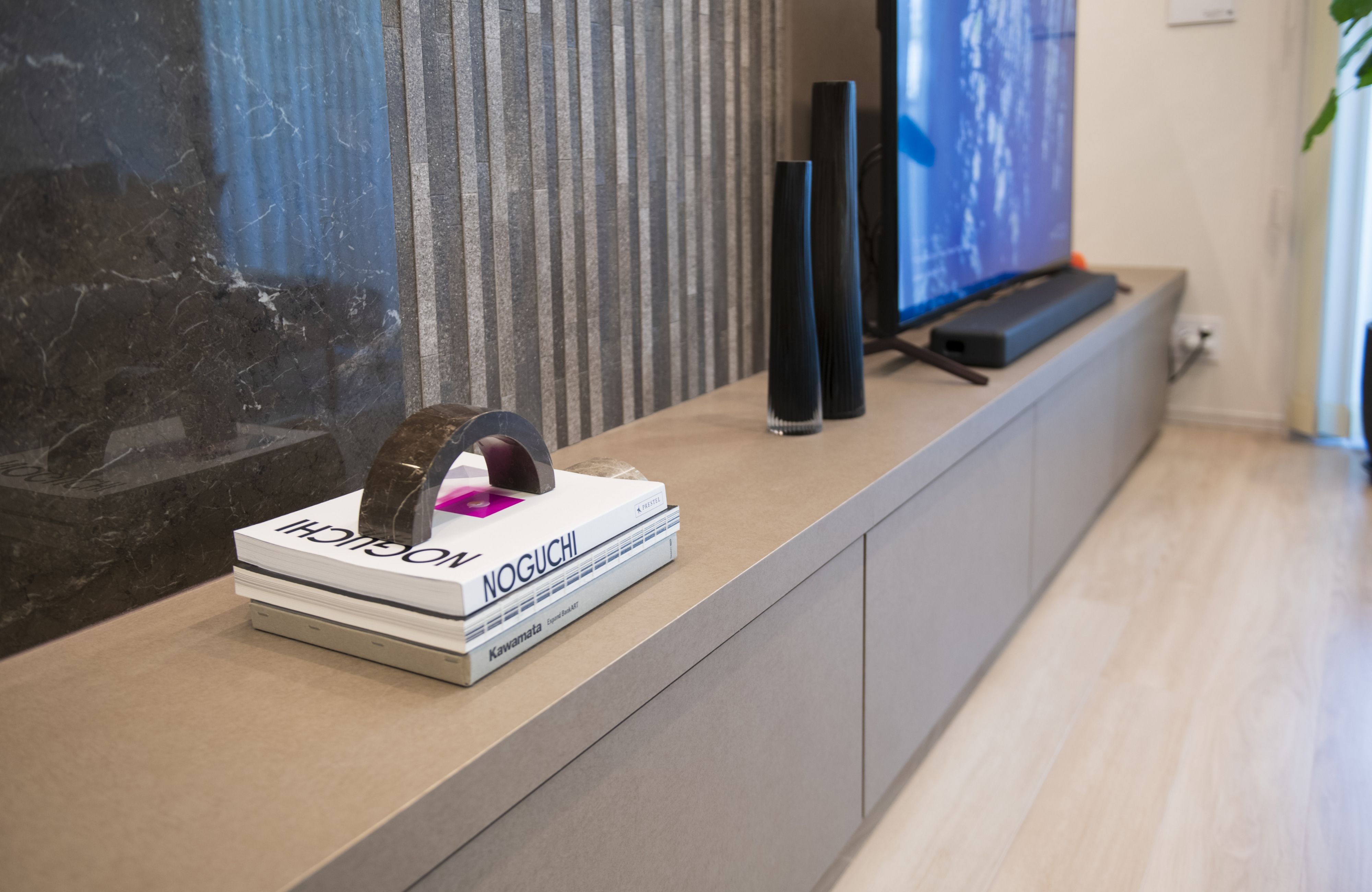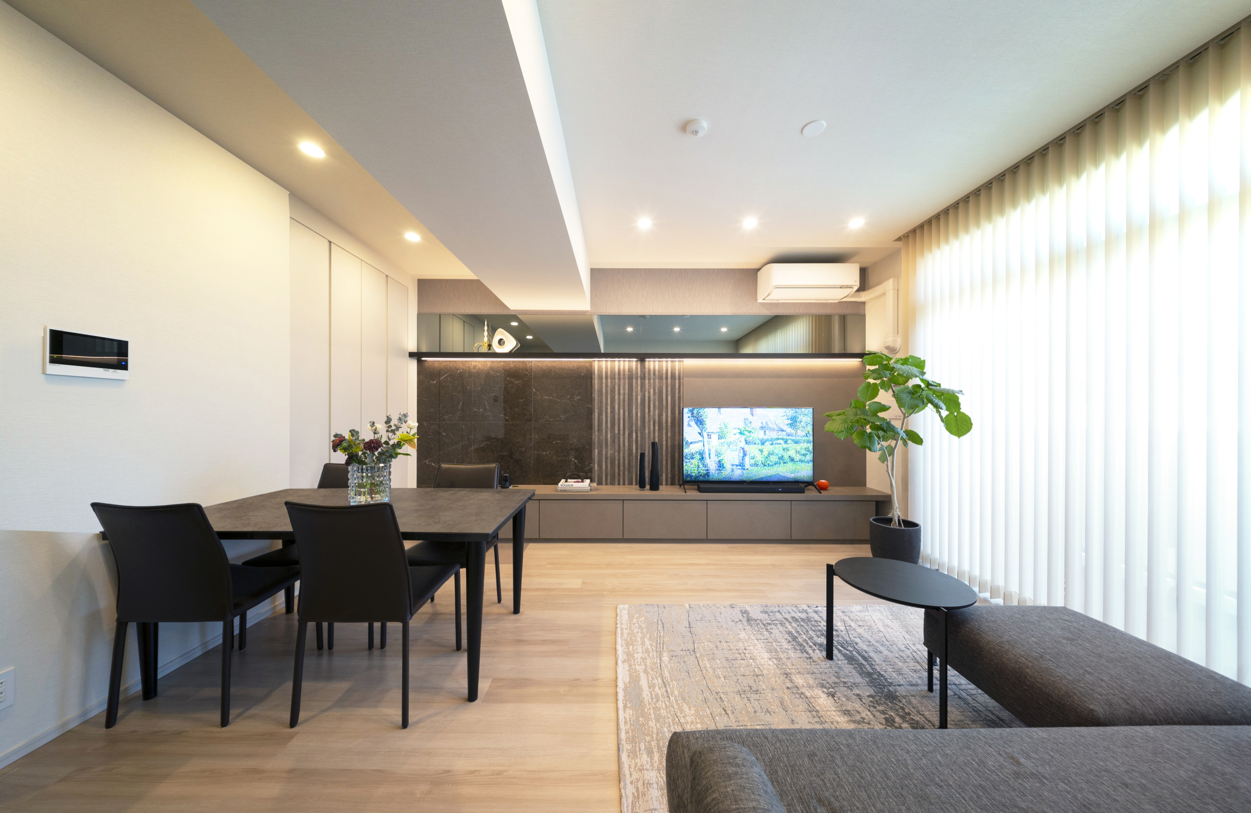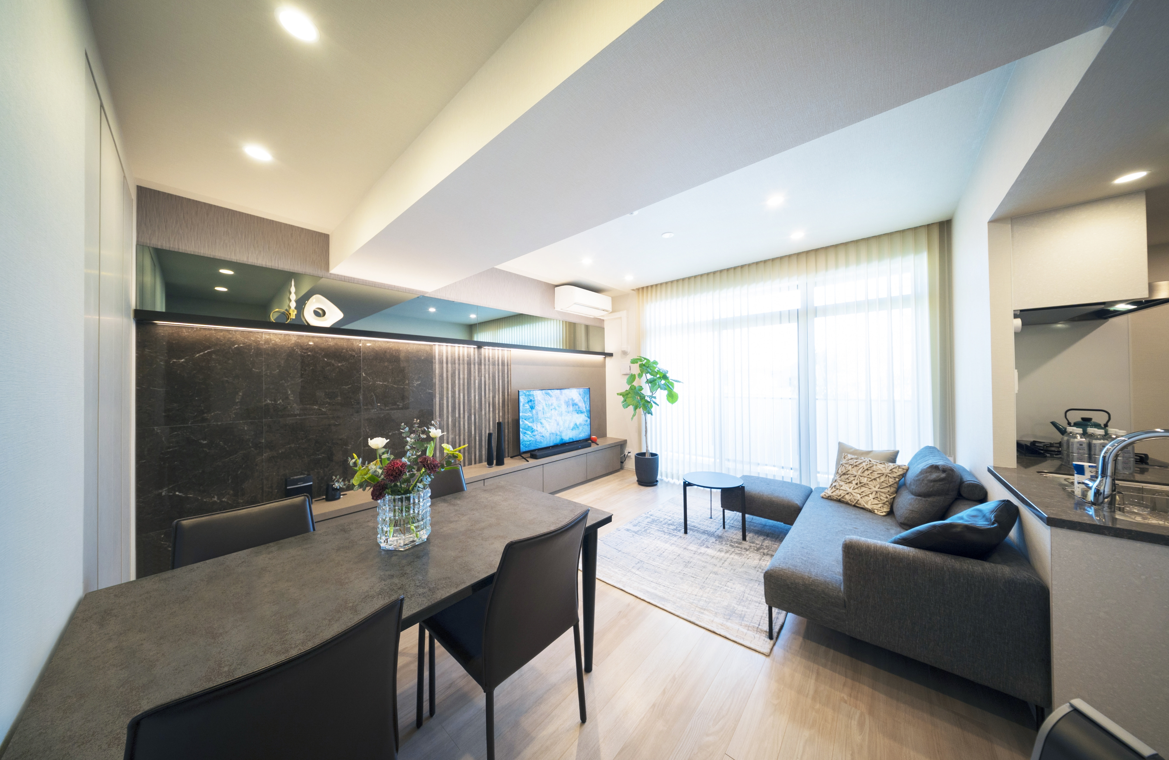リビングの壁は、大理石やエコカラットをアクセントにして組み合わせ、スタイリッシュに仕上げました。クレヴィアから紹介を受けたインテリアコーディネーターさんに相談して決めていきました。空間の広がりを感じさせるよう上部には鏡をあしらい、下部には収納スペースを造作しました。