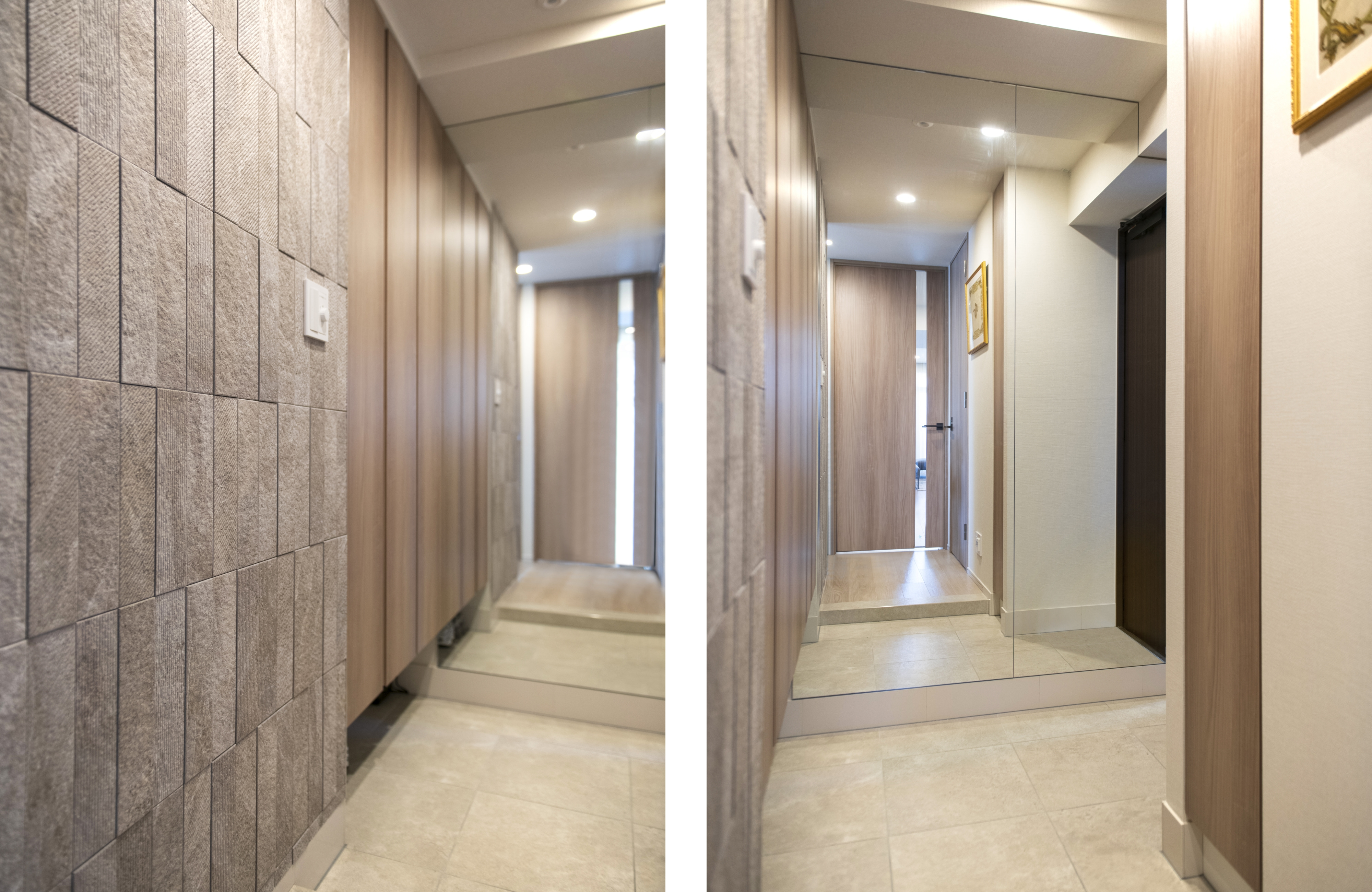 デザイン性と実用性を兼ね備えたアレンジとして、廊下の壁面にはエコカラット、正面には全面鏡を設置しました。