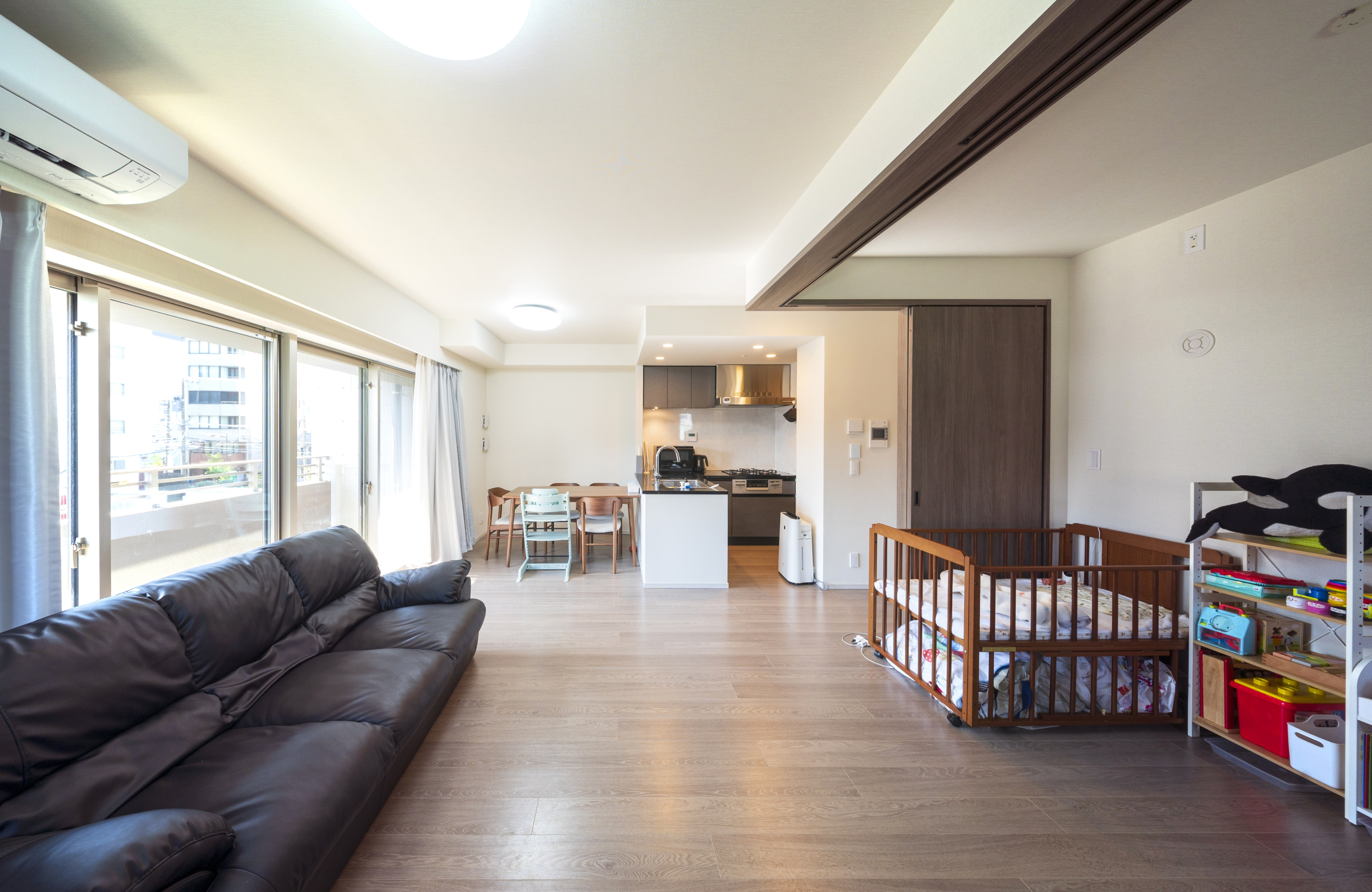 広々としたリビングがみんなの居場所です。キッチン、解放した続き部屋を合わせるとほぼ20畳、南向きで光がいっぱいに入ります。本来なら部屋に合うソファセットや壁装飾を入れたいところですが、今は、子どもが動き回れる空間の確保を優先しています。