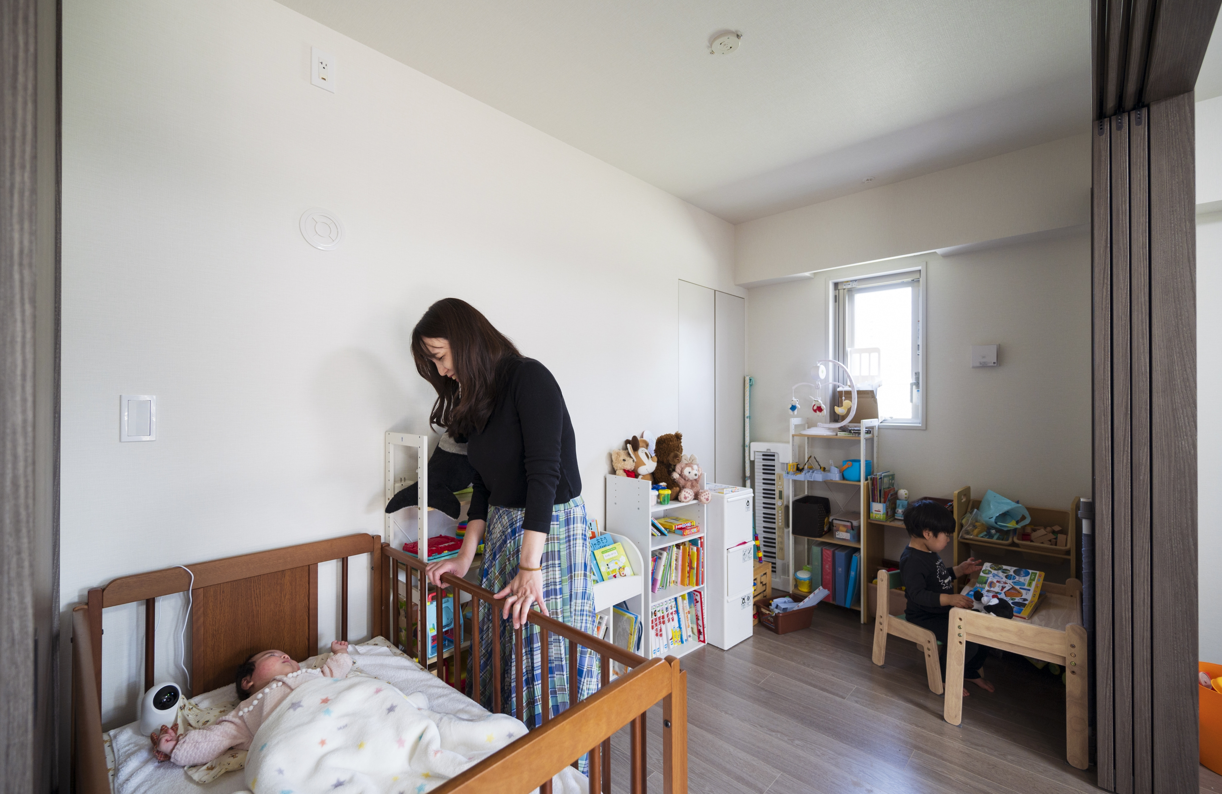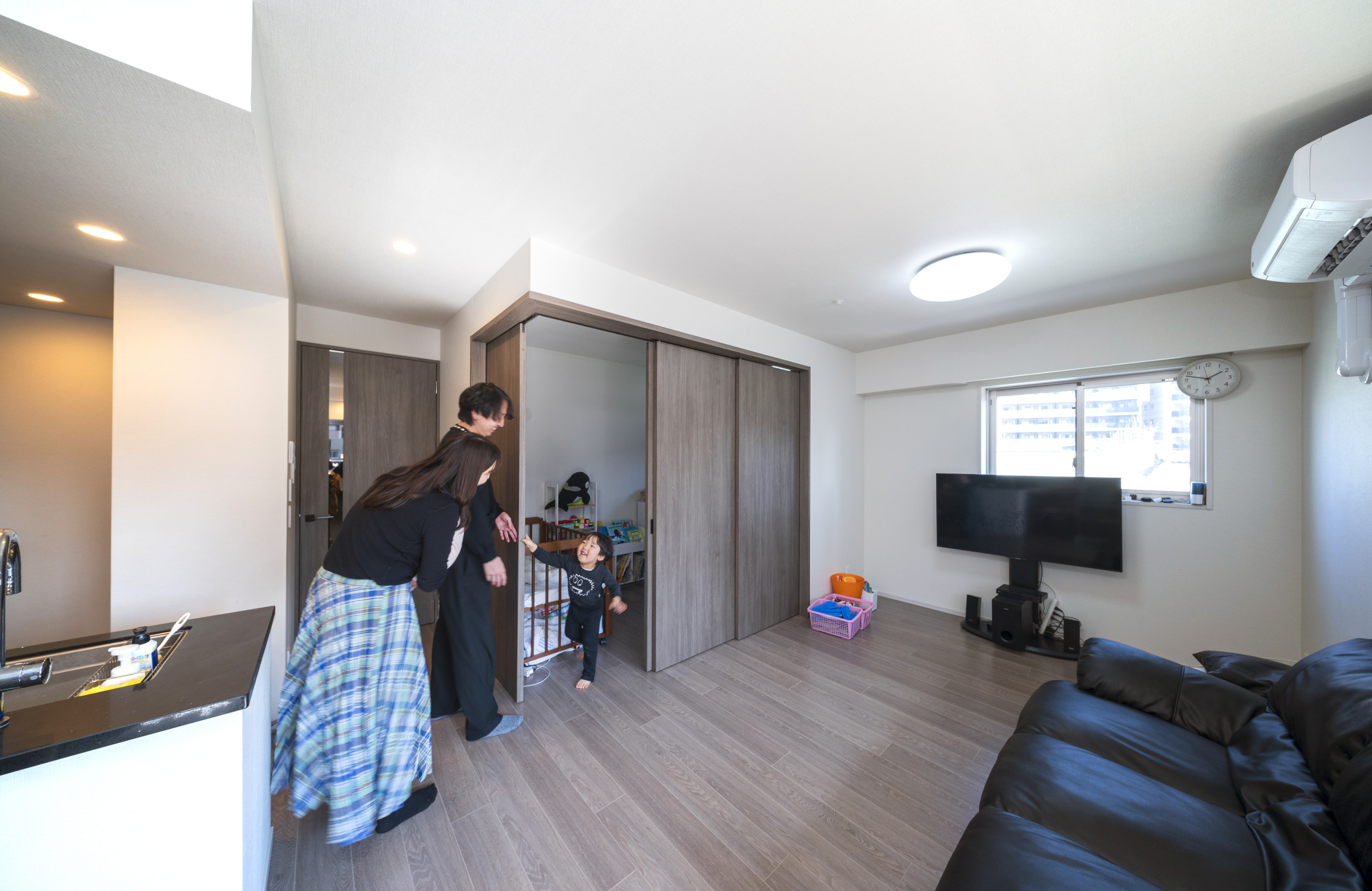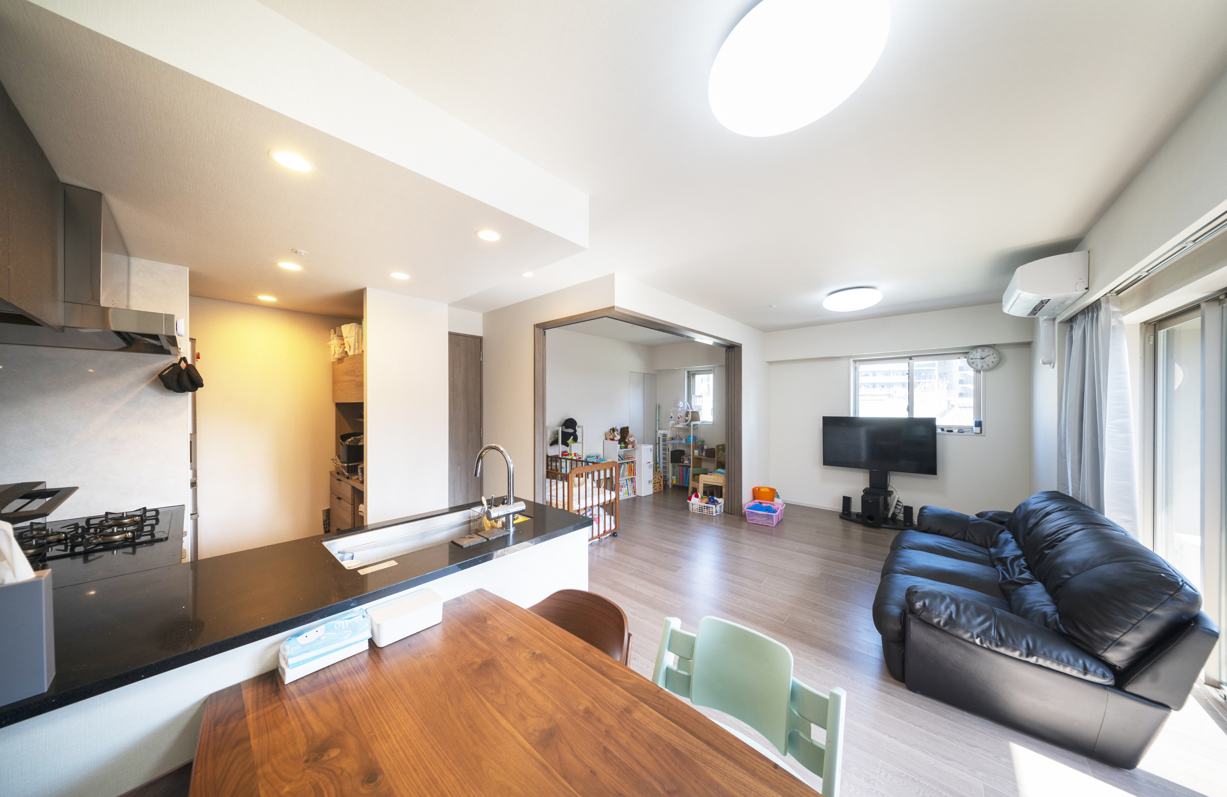 リビングに隣接する洋室は、現在はリビングルームと一体化させて使用しています。子どもたちが成長するにつれて、個室などに変更することが可能です。