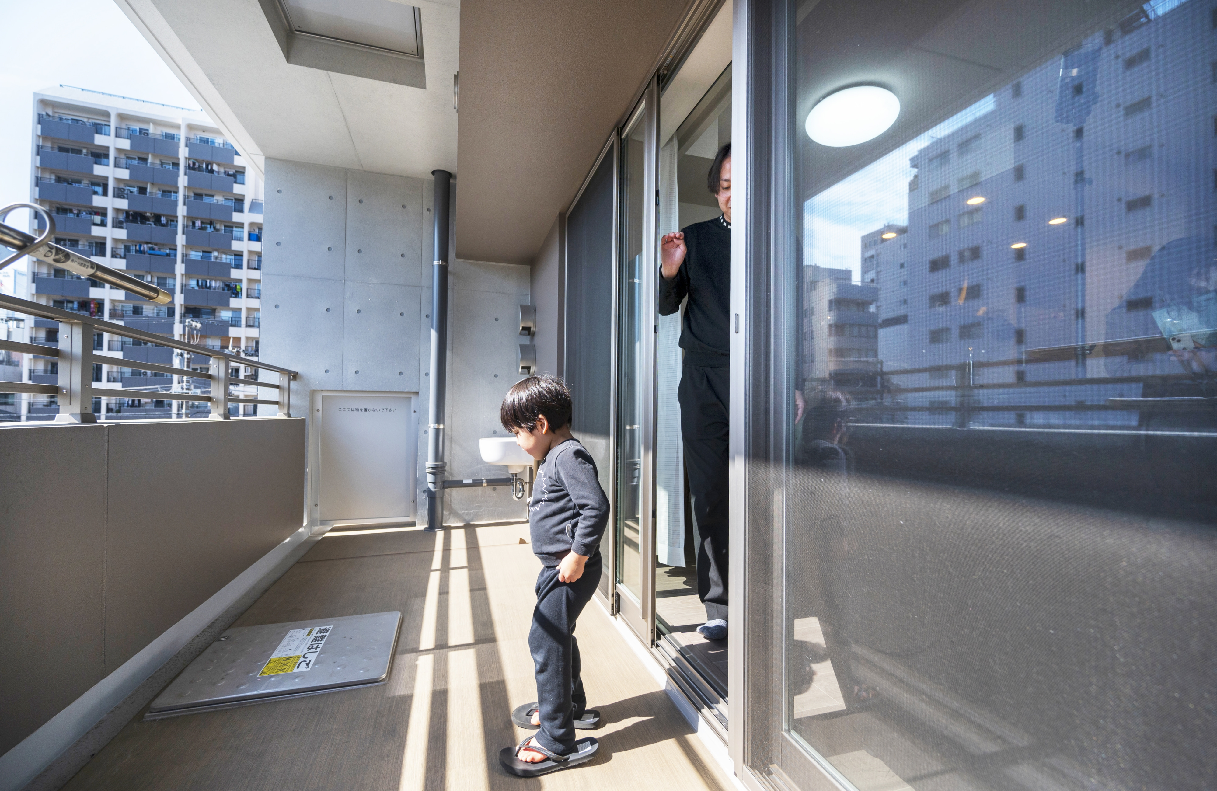 南向きのバルコニーは奥行きが広く、テーブルセットなどを置くこともできます。スロップシンクが設置されているので、夏になったらビニールプールを置いて水遊びをするのが楽しみです。