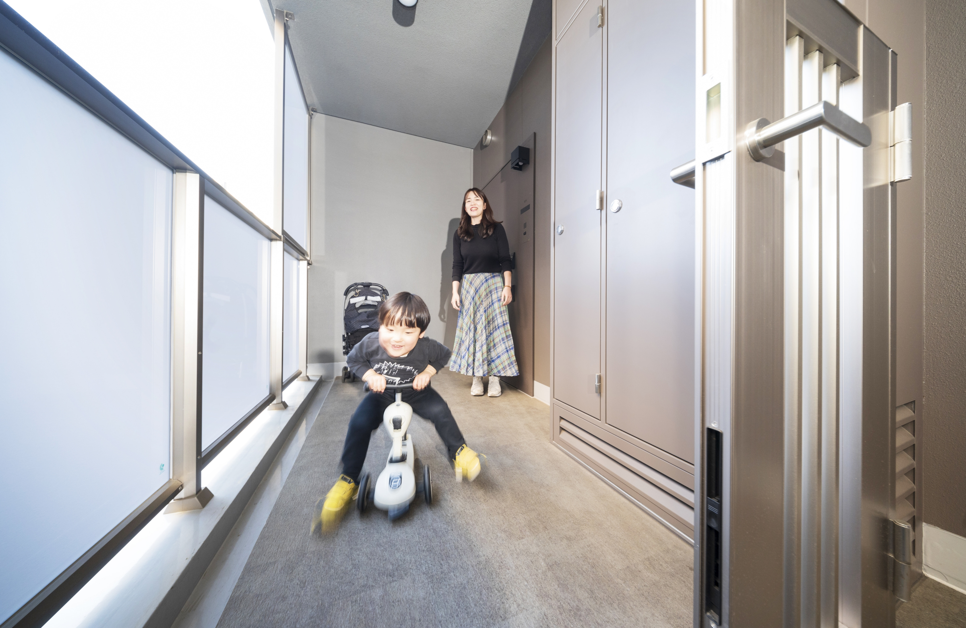 ベビーカーやおもちゃを置ける玄関ポーチ