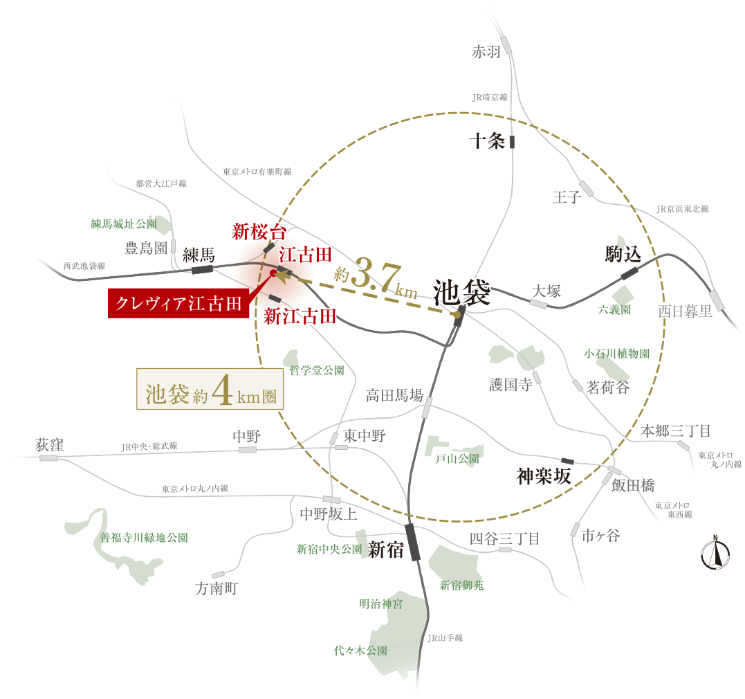 ※掲載の距離圏図は、本物件の池袋から直線距離で約3.7kmにあることを表現する概念図です。地形・距離・方向等は実際とは異なります。