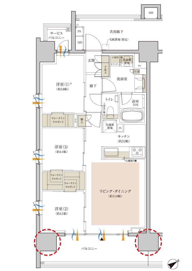 バルコニー面積/11.25㎡(約3.40坪) サービスバルコニー面積/2.40㎡(約0.72坪)