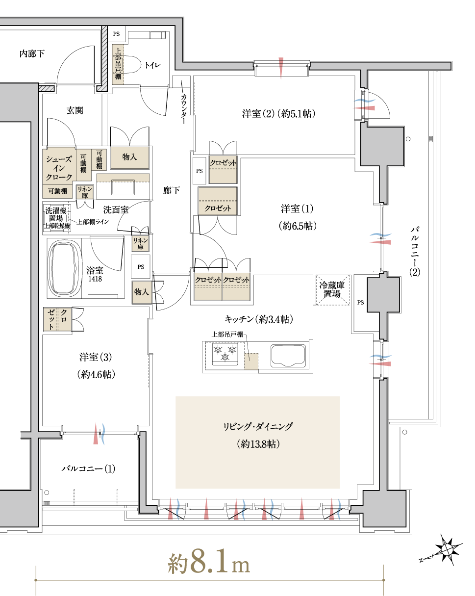 2面開口の開放的なプラン