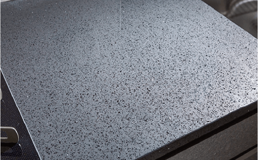 天板は天然水晶と樹脂等からなる人造石です。天然石の風合いはそのままに、樹脂による強度もあわせ持つ素材です。