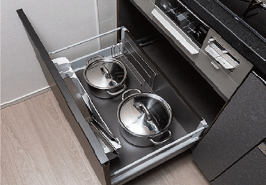 キッチンのスライドキャビネットと開き扉には、ゆっくりと閉まるソフトクローズ機能を採用。