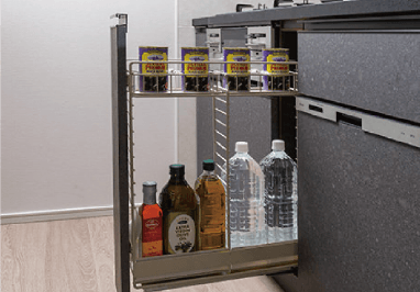 調理カウンターとコンロの間に設けたラック。両側から調味料を取り出すことができます。