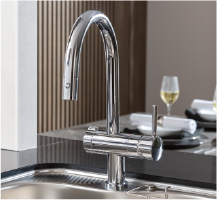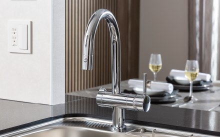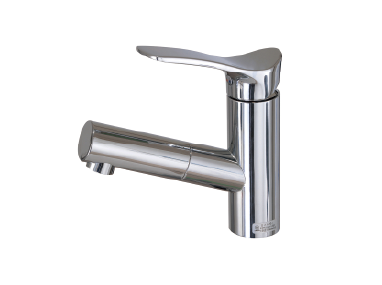 ノズルを引き出してシンクのお掃除ができるハンドシャワータイプの浄水器一体型水栓です。
