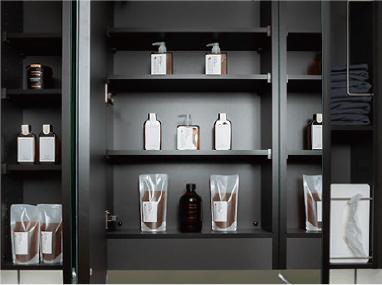 三面鏡の裏側は収納スペースを確保し、化粧品など小物を収納できます。