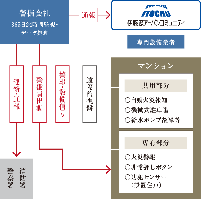 万一の火災や専有部への不正侵入、共用部の設備異常が起こった場合、警備会社の監視センターならびに管理会社へ自動通報されると共に、警備員が駆け付けて適切な対応を行います。