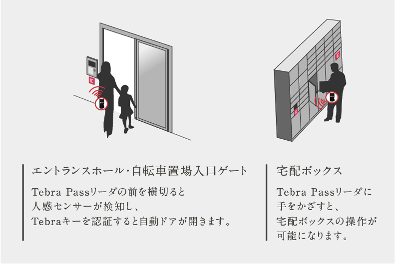 風除室には、鍵をカバンやポケットに入れたままオートロックが解除できるTebraキーシステムを採用しました。