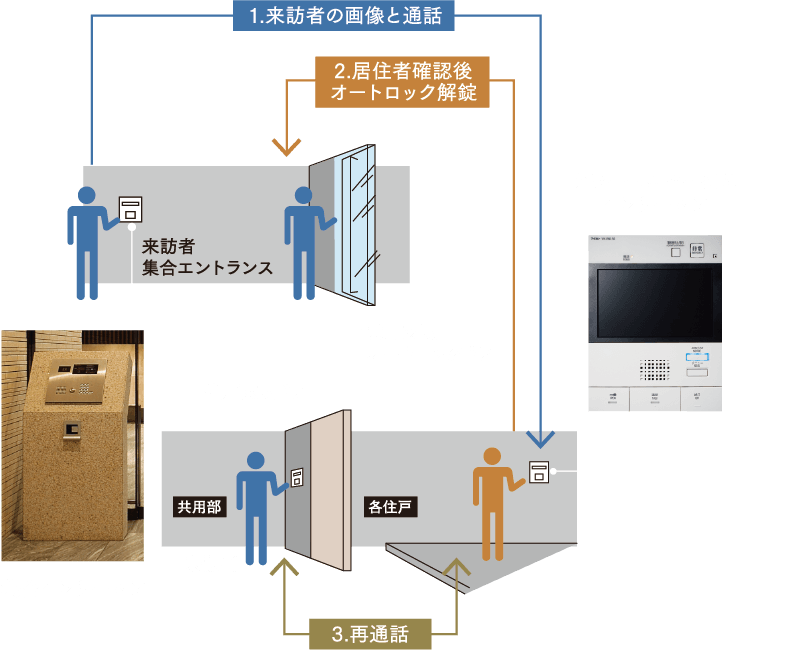 集合エントランスの来訪者を、住戸内に設置されたモニター画面で確認し、エントランスドアの開錠操作ができるカラーモニター付オートロックを採用しています。さらに住戸玄関でも訪問者を音声を通じて、再確認できます。