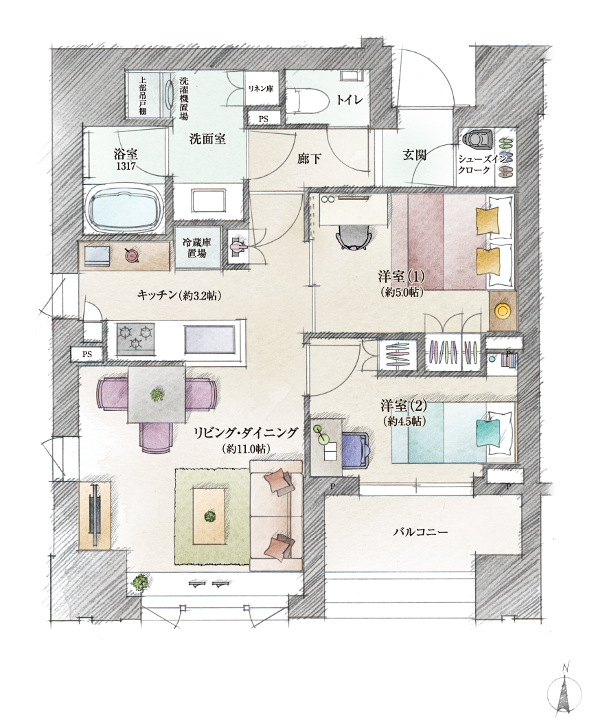 ※掲載の間取図および間取りイラストは計画段階のもので、今後変更になる場合があります。家具配置については家具を配置した場合の一例を想定して作成したイメージで、家具の大きさ等は実際とは異なります。また、家具・調度品は販売価格には含まれておりません。掲載の基準階平面図は計画段階のもで、今後変更になる場合がございます。