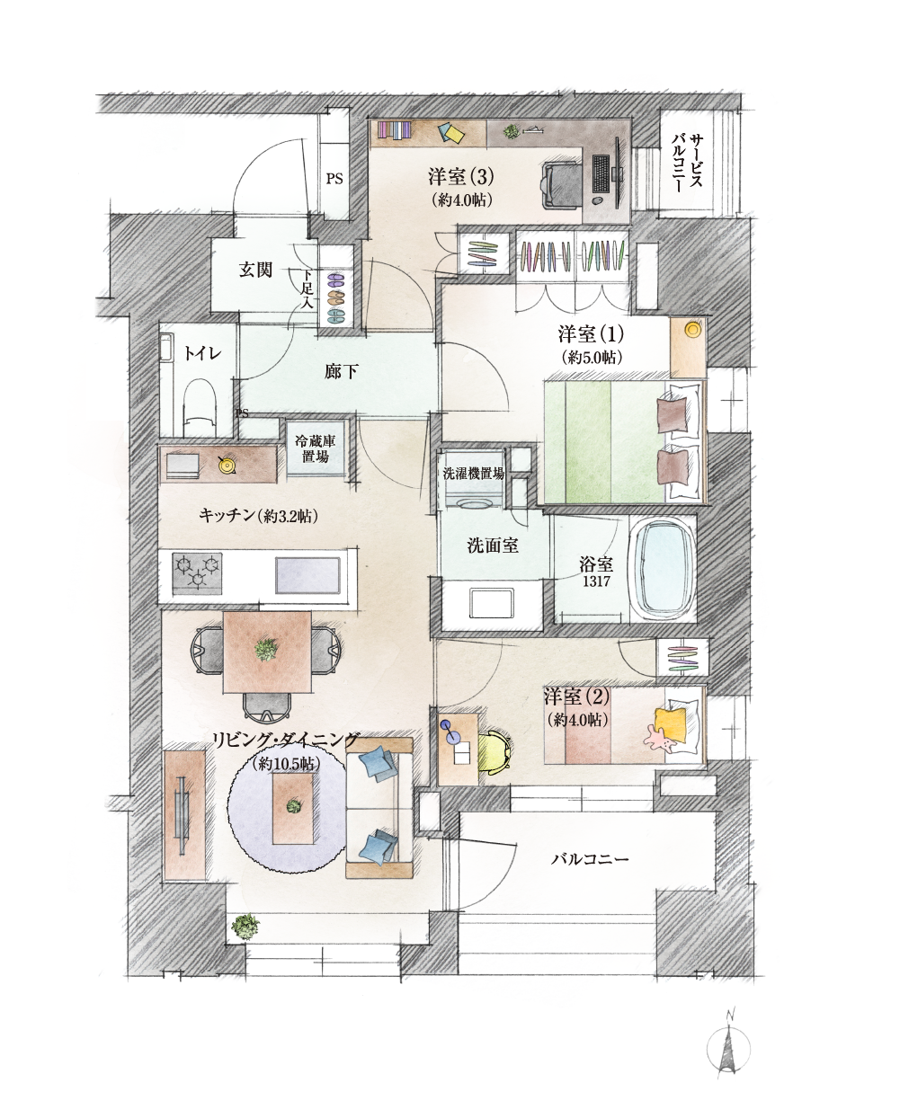 ※掲載の間取図および間取りイラストは計画段階のもので、今後変更になる場合があります。家具配置については家具を配置した場合の一例を想定して作成したイメージで、家具の大きさ等は実際とは異なります。また、家具・調度品は販売価格には含まれておりません。掲載の基準階平面図は計画段階のもで、今後変更になる場合がございます。