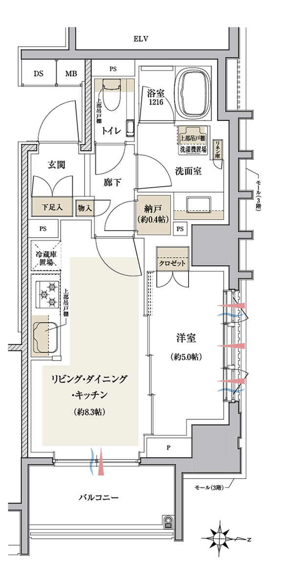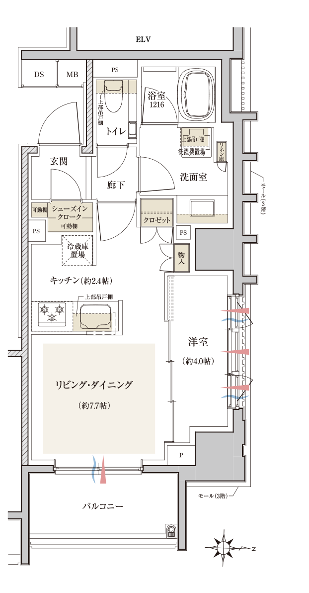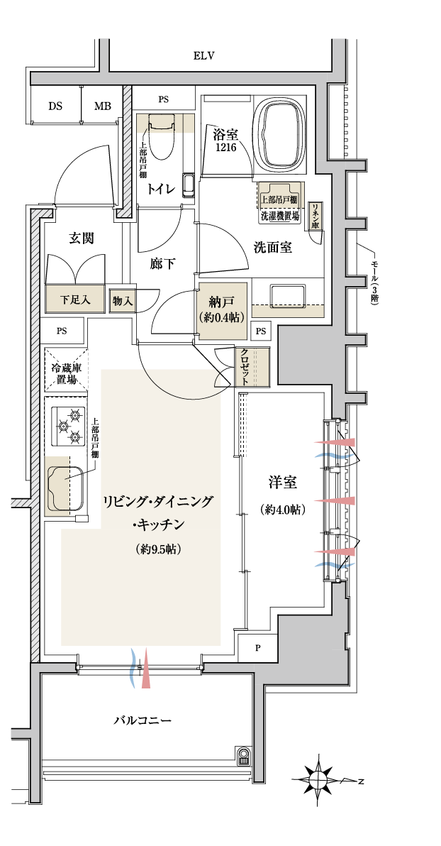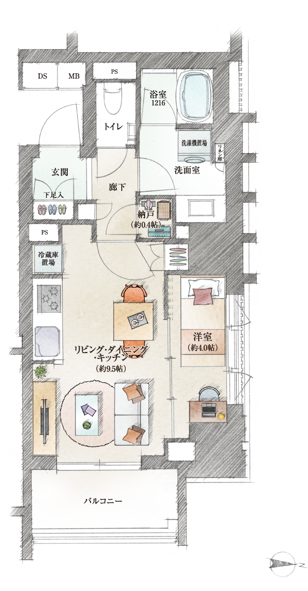 廊下面積を小さくし、約0.4帖の納戸を設けるなど、