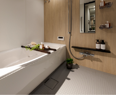 ウルトラファインバブル入りのお湯を家中で使用することができる給湯器を採用。目に見えないほどの小さな泡が水まわりの汚れを付きにくくし、乾燥しがちな肌のうるおいを持続させます。