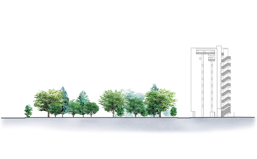 道路を挟んで神奈川公園(徒歩1分・約20m)に臨む立地を生かし、24邸すべての住戸にパークビューを実現。成熟した緑の潤いと四季の彩り、木々の頭上に広がる空の表情が、静かに心を解き放ってくれる住まいです。