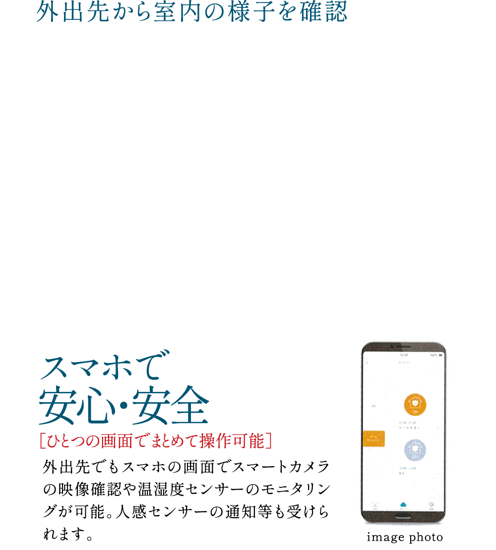 〈オプション〉外出先からスマホで手軽に室内の映像を視聴。上下左右に首振りでき、双方向の通話も可能。ホームセキュリティに安心です。