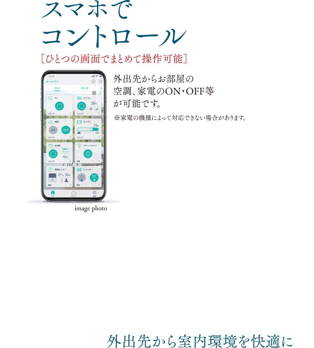 〈オプション〉アプリに連動している機器をボタンで操作することができます。家電の一括ON/OFFやセキュリティ設定などが可能です。