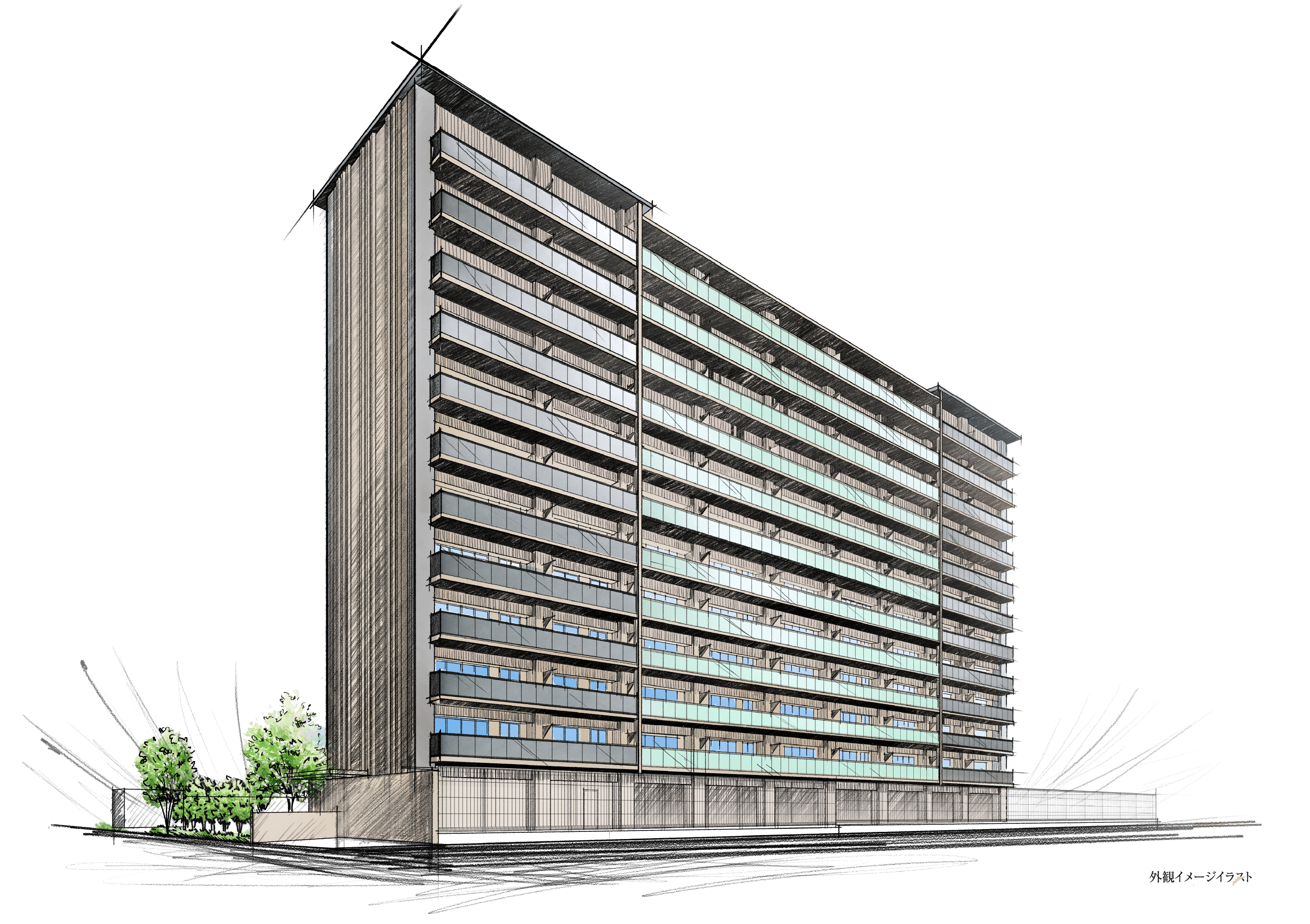 ※掲載のイメージイラストは、設計図を基に描き起こしたもので、官公庁の指導、施工上の都合等により建物の形状、色調・植栽等に変更が生じる場合がございます。