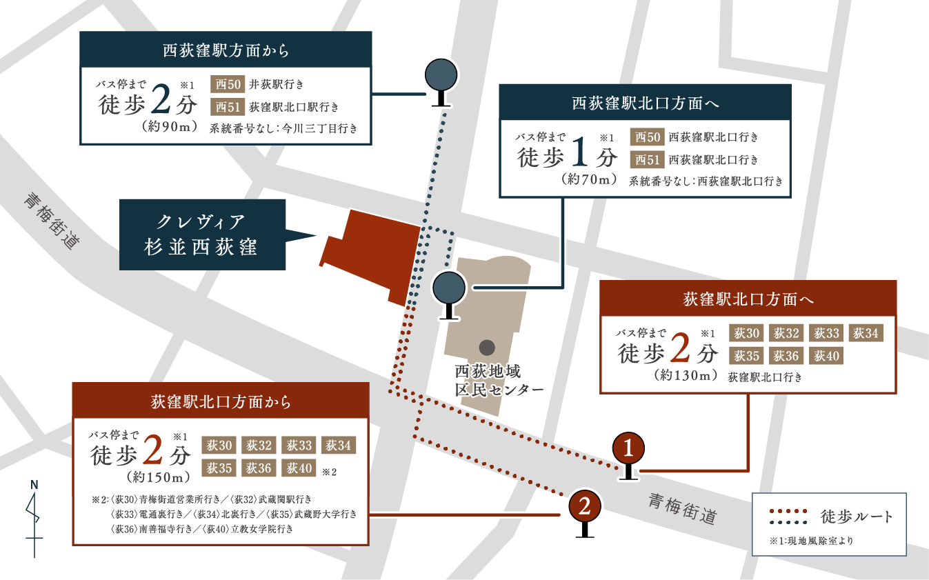 ※バス/「西荻窪駅北口」バス停から「桃井四丁目」バス停まで乗車約2分。出典元/Yahoo路線情報