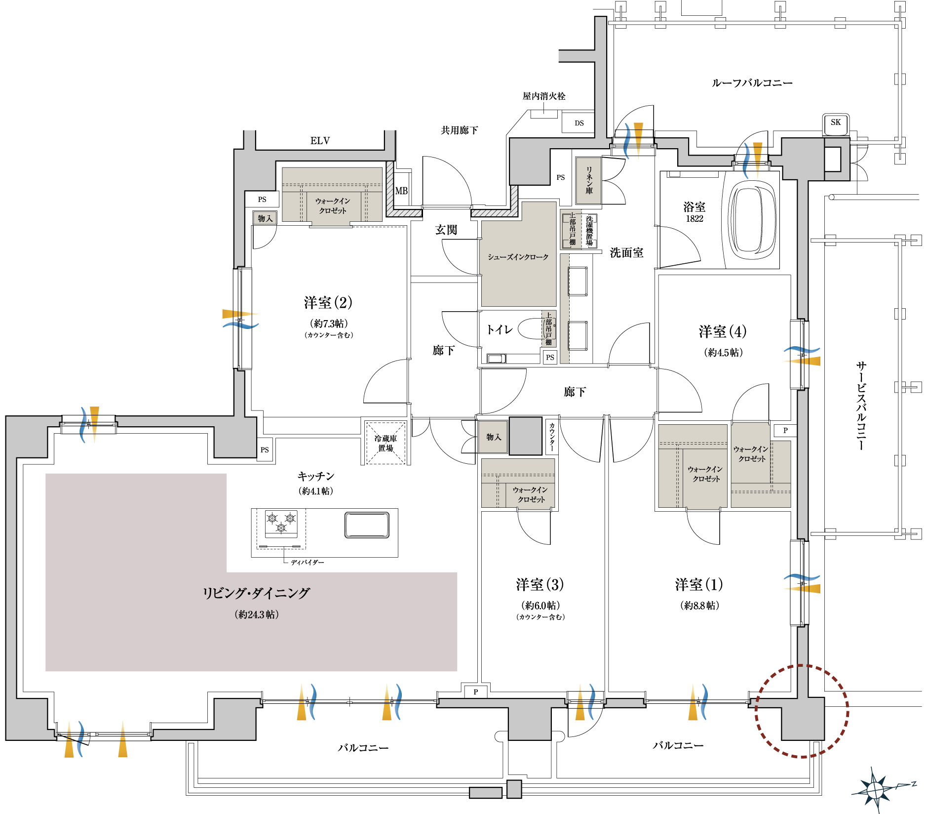 ●約24.3帖のリビングダイニングは
