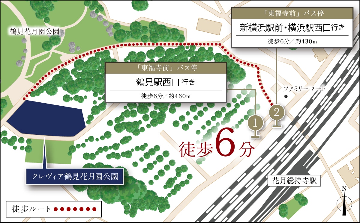 花月総持寺駅前にある「東福寺前」バス停留所へ徒歩6分。そこから「鶴見駅西口」バス停留所へは約5分でアクセス。バスの運行本数が多く、日常の足として便利に利用できます。