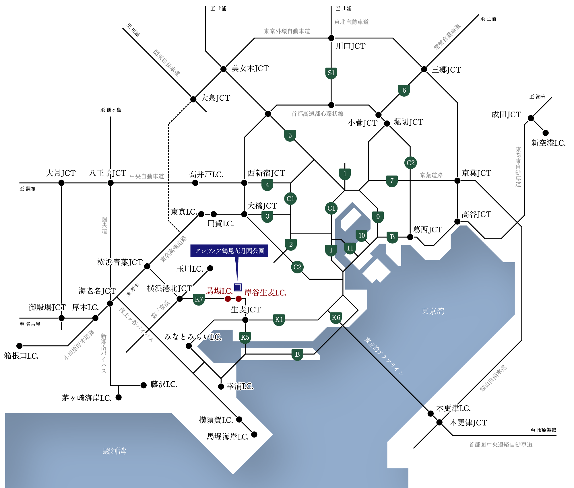 首都高速神奈川7号横浜北線「岸谷生麦」入口まで約1.7km、「馬場」入口まで約3.3kmと、車で利用しやすい距離。みなとみらいや空港、浦安、御殿場などへのカーアクセスが快適で、レジャーの幅も広がります。