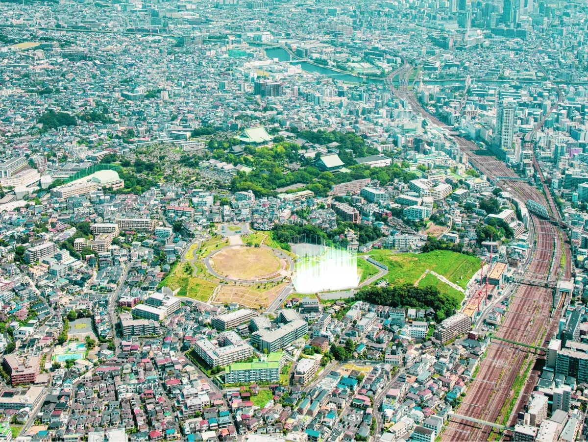 ※掲載の航空写真は2025年7月に撮影したものに一部CG加工を施したもので実際とは異なります。計画地の位置を表した光は高さや規模、向きを正確に表すものではありません。また、周辺環境は将来変わる場合があります。