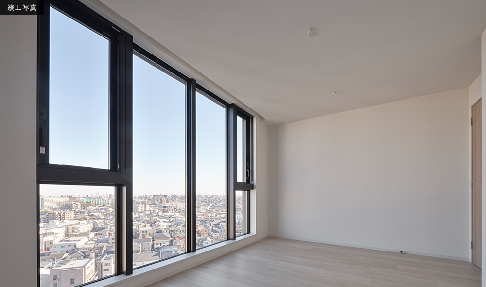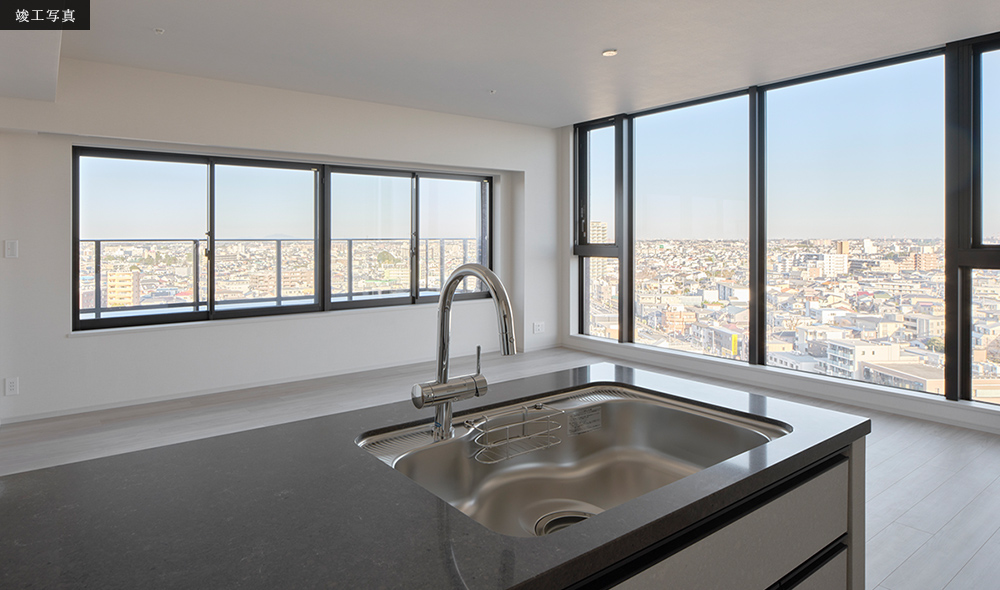 ※掲載の完成予想CGは、計画段階の図面を基に描き起こしたCタイプ/リビング・ダイニングと現地より撮影した南東向き方面の眺望(14階相当/2024年3月撮影)を合成加工したもので実際とは異なります。形状・色彩・外構・植栽等は実際とは異なります。形状の細部・設備機器・配管等は省略または簡略化の上、表現しております。今後、行政指導・施工上の理由等により、計画に変更が生じる場合があります。家具・調度品は販売価格に含まれておりません。眺望は階数や部屋によって異なります。また眺望は周辺環境の変化などによって変わる場合があり、将来的に眺めを保証するものではございません。